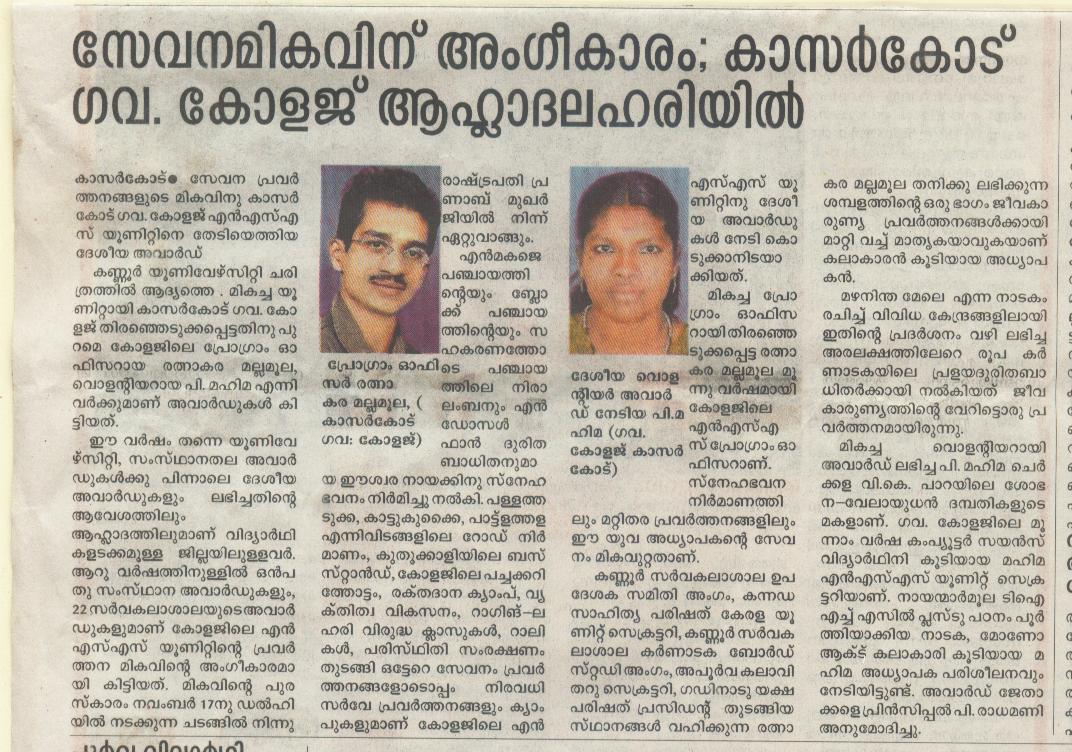 - The National Service Scheme (NSS) of this college has been doing remarkable work during the last five years. The unit has been in the forefront of all the activities in the college and has offered many selfless services to the society. The NSS units have already bagged 6 State awards, 16 University awards during the last five years for their community service and enterprising attitude. Apart from the incessant regular activities in the campus, the units organise many community contact programmes in and outside the campus. The NSS plays a large role in making the students socially committed, selfconfident and responsible citizens of the nation. It would be pertinent to note that the committed efforts by the enterprising programme officers of the NSS, Mohammed Ali .K and Rathnakara ., took the NSS units to exceptional achievements during the last five years. The support given by the NSS to the anti-endosulfan movement and the activities it did to augment the struggle were applauded by many all over the state. The units have taken Enmakaje Grama Panchayath (The Endosulfan affected panchayat) as their adopted village for the last four years.